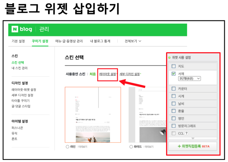 * 이동경로 : 블로그 관리 -> 꾸미기 설정 -> 레이아웃 -> 위젯직접등록
